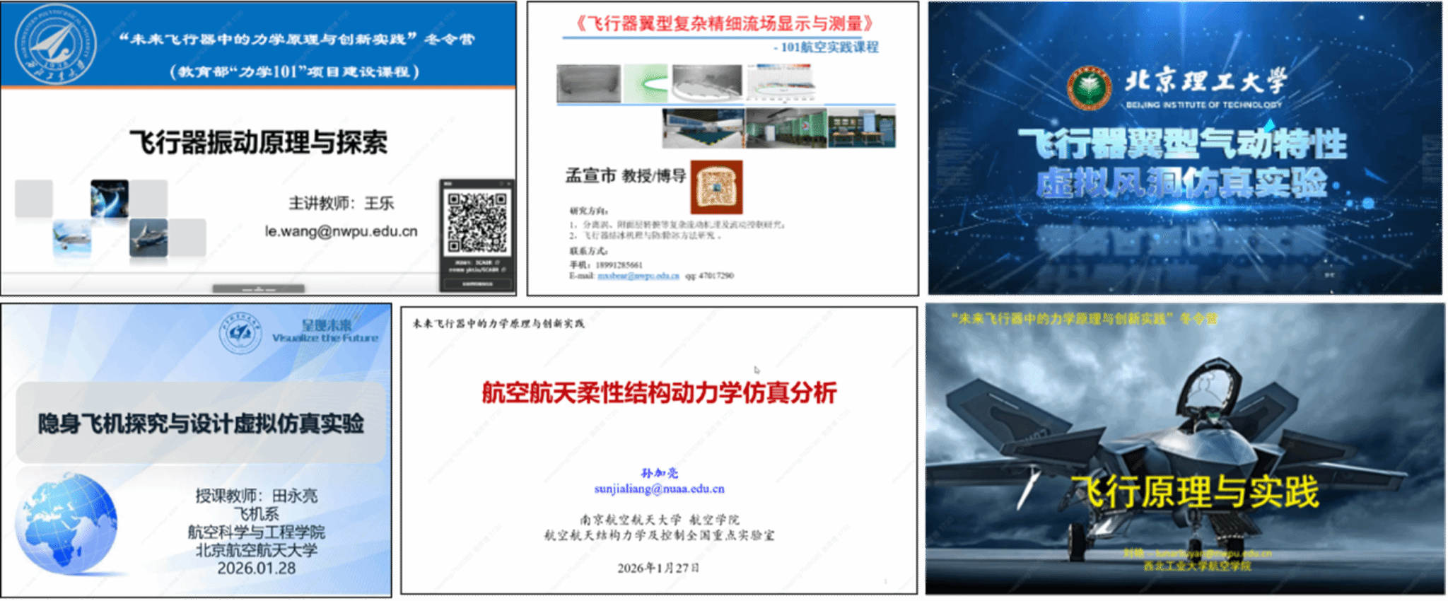 本次冬令营共设置六门专题课程,内容紧扣飞行器力学基础与工程应用前沿:西北工业大学王乐老师以《飞行器振动原理与探索》为题,系统讲解振动基本理论、控制方法及工程应用实例。南京航空航天大学孙加亮老师以《航空柔性结构动力学仿真分析》为题,围绕柔性结构动力学建模与多体系统耦合仿真,介绍航天器微振动分析与抑制方法。北京理工大学赵瑞老师以《飞行器翼形气动特性虚拟风洞仿真实验》为题,通过虚拟实验平台解析翼型设计对气动性能的关键影响。北京航空航天大学田永亮老师,以《隐身飞机探究与设计虚拟仿真实验》为题,介绍了隐身技术基本原理与虚拟仿真设计流程。西北工业大学孟宣市老师以《飞行器异形复杂流场显示与测量》为题,系统讲解实验空气动力学方法及风洞试验技术体系。西北工业大学刘艳老师以《飞行器原理与实践》为题,围绕飞行原理与典型飞行过程,解析飞行器性能与稳定性问题。