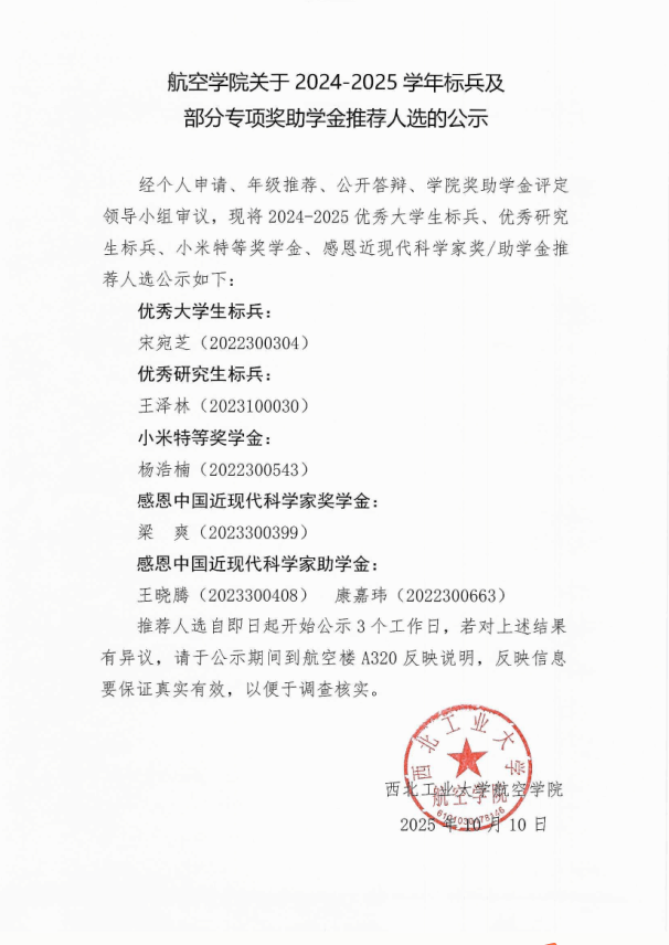 上一篇:航空学院关于2024-2025学年先进集体推荐的公示 下一篇:航空学院关于2024-2025学年本科生国家奖学金推荐人选的公示