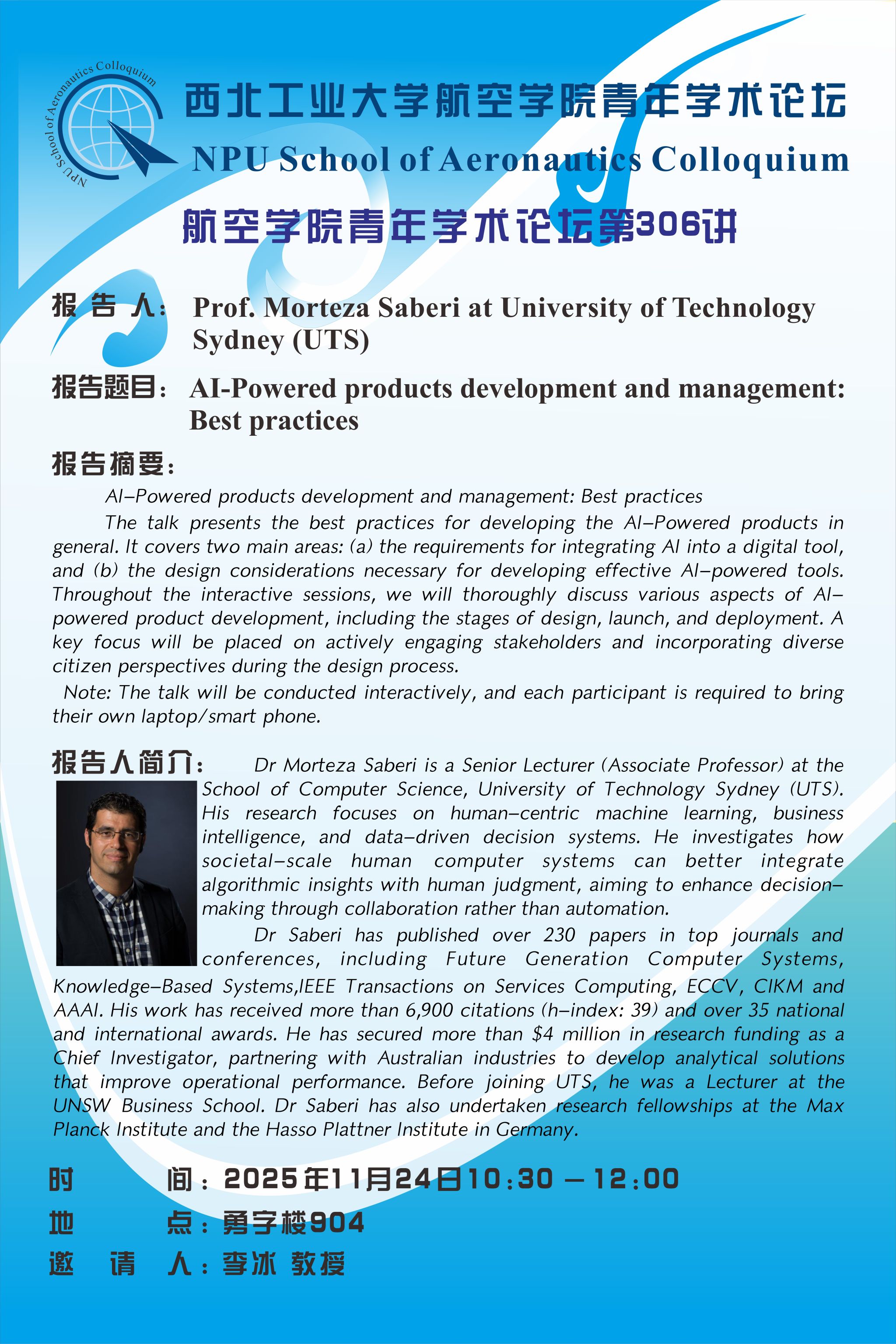 School of Aeronautics Colloquium No 306- Prof. Morteza Saberi at University of Technology Sydney (UTS)