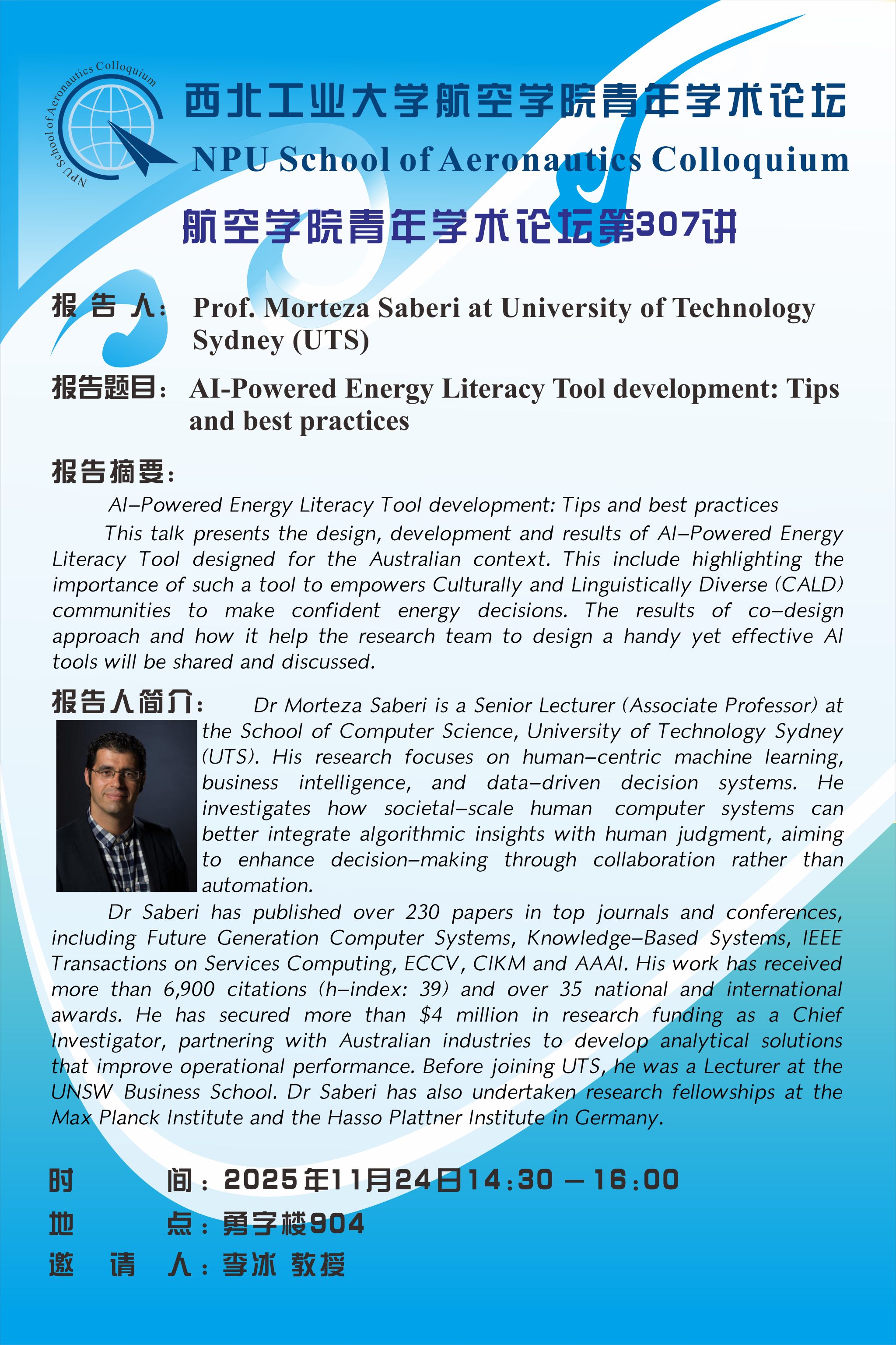 School of Aeronautics Colloquium No 307- Prof. Morteza Saberi at University of Technology Sydney (UTS)