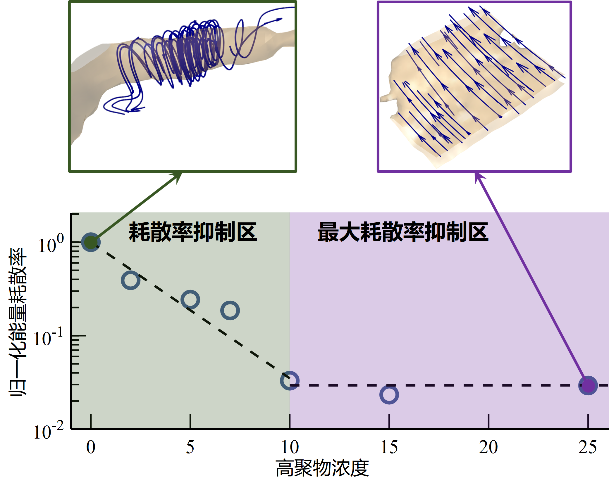 在流体中加入微量长链柔性高聚物可显著降低壁面摩擦阻力,减阻效果高达80%,在流动减阻、流动噪声控制等领域具有重要应用前景。在壁湍流中,随着浓度的增加,高聚物的减阻效果分为三个典型区间:阻力不变、减阻区和最大减阻区。在远离壁面的各向同性湍流中,高聚物的卷曲拉伸行为为流动带来新的能量传输机制,改变湍流能量从大尺度结构向小尺度结构传递的过程(Xi et al., Phys. Rev. Lett., 2013; Zhang et al., Sci. Adv., 2021)。然而,高聚物如何影响各向同性湍流的耗散机制和湍流结构,一直是学界未解之谜。